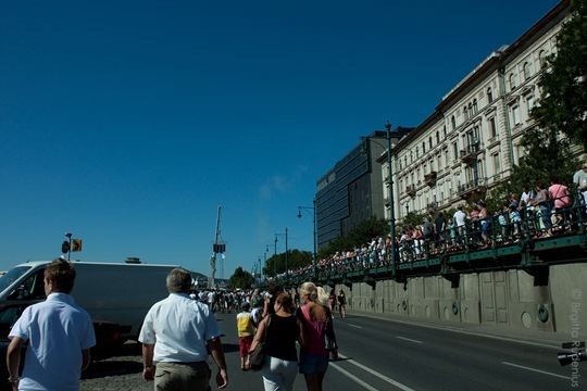 Vid Bazilikan börjar folk ta plats innaför kravallstaketen. Jag måste hem och duscha igen och rasta Milton innan vi ger oss ut för kvällens fyrverkerier.